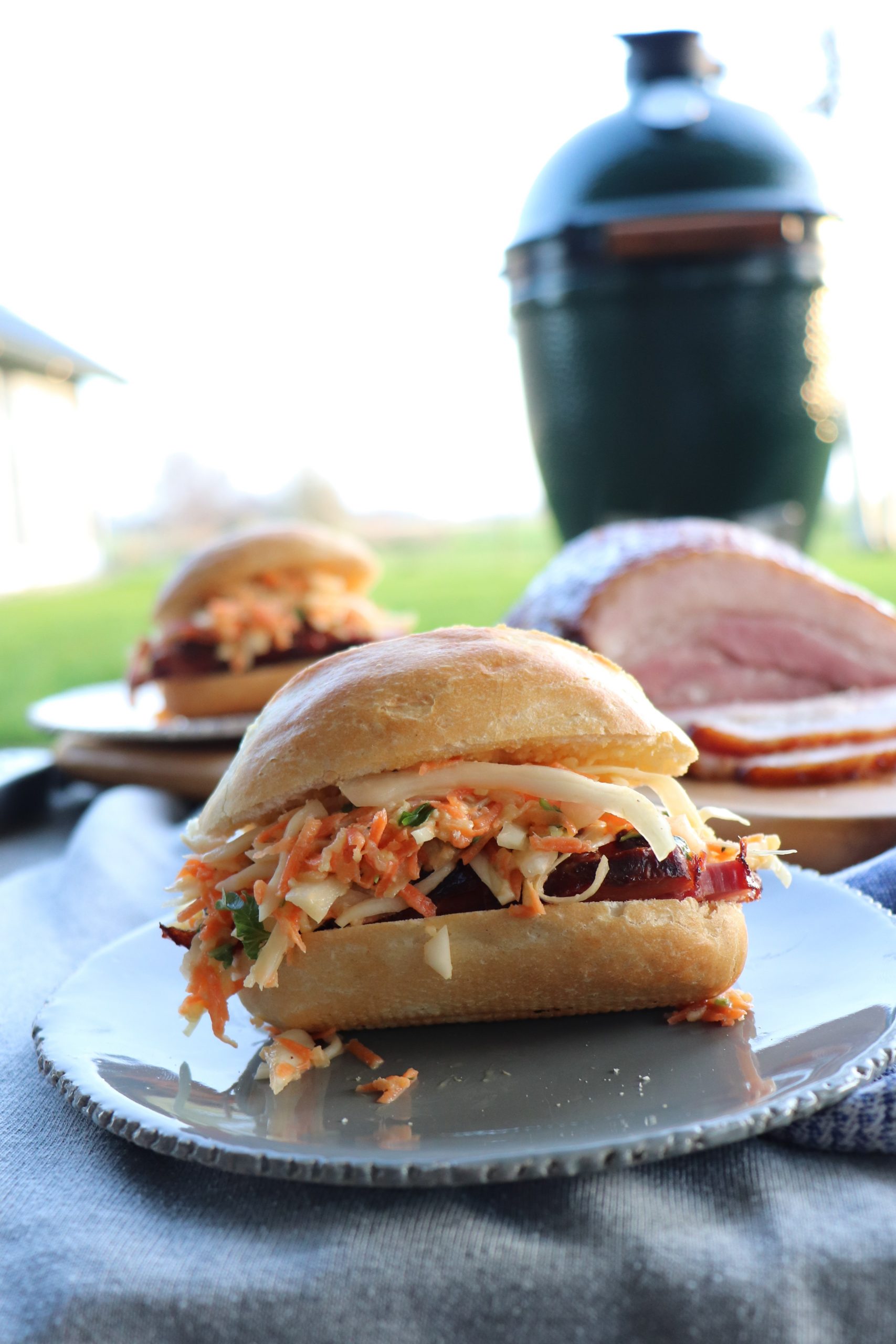 Broodje met gegrild buikspek en witte koolsalade op de Big Green Egg