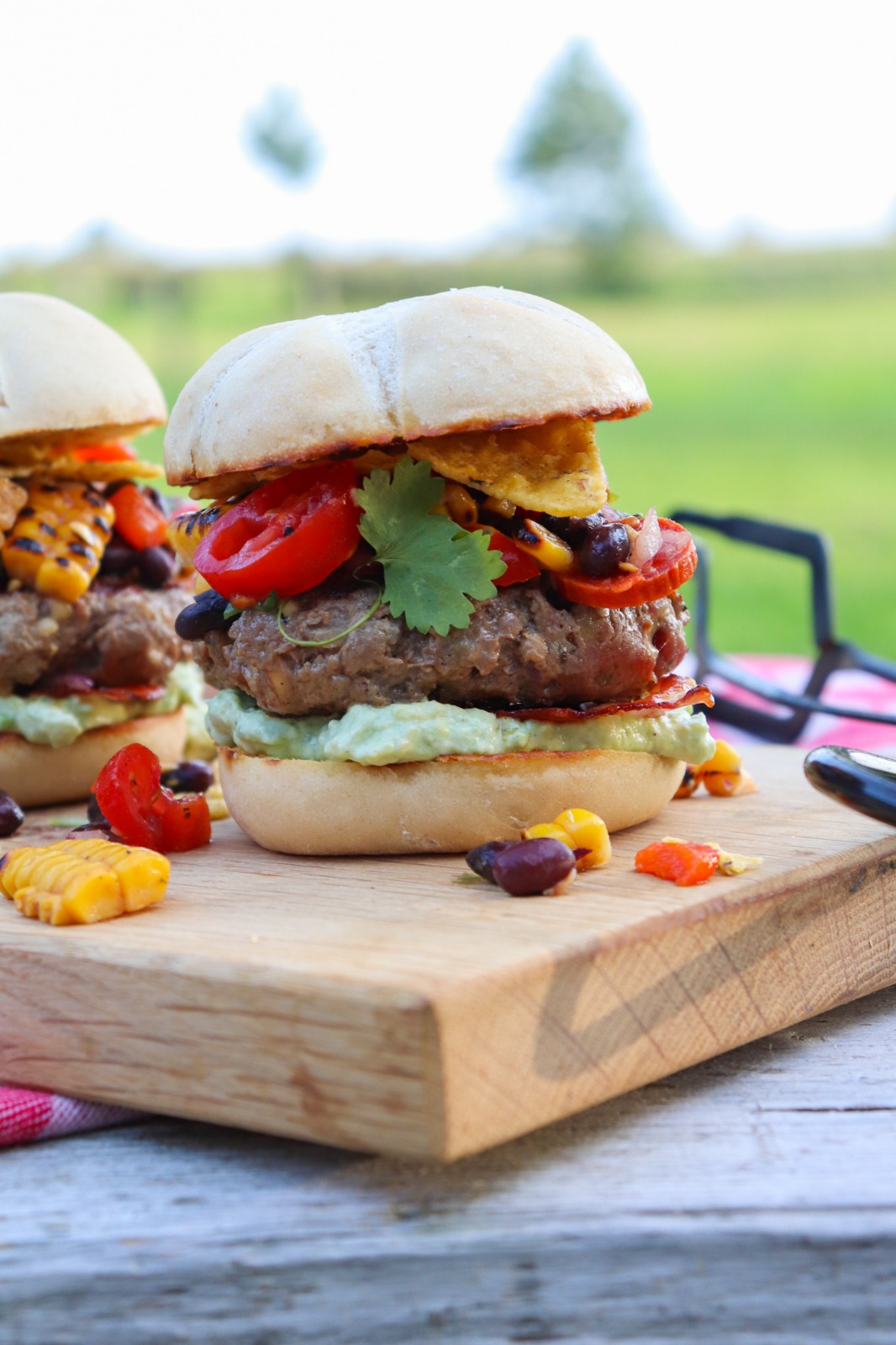 Snijd de keizerbroodjes door en smeer de binnenkant in met boter. doe de broodjes met de geboterde kant naar beneden op de barbecue. Leg ook de burgers en de bacon op de barbecue. Zodra de broodjes mooi bruin zijn haal je ze er af doe je een grote lepel avocado saus op de onderkant. Wanneer de bacon en de burger klaar zijn kunne die er boven op. Doe er als laatste nog een schelp bonensalsa en wat nacho’s op voor je de bovenkant er weer op doet. Eet het met wat extra nacho’s en bonensalsa ernaast.